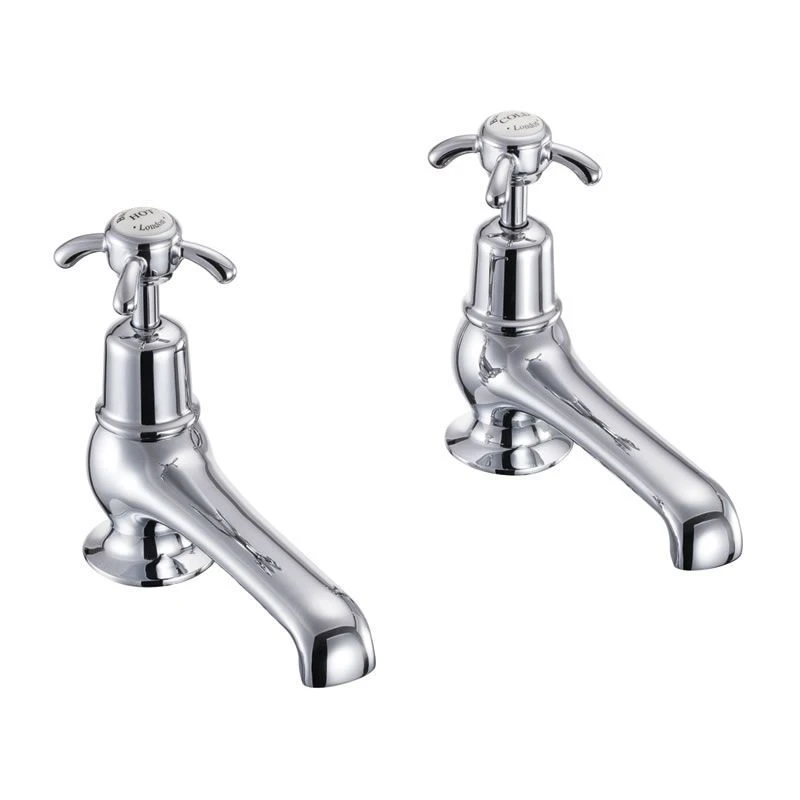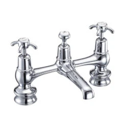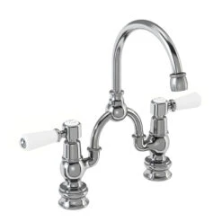 Take your bathtub back to a more traditional time with these Anglesey Deck Mounted Bath Pillar Taps from Burlington. The delicate, curved spouts reach into the bathtub and add a real splash of charm and splendour to the room. Four spoke tap handles are the favoured feature of these taps though, given that they add such period elegance to the overall design. Crafted from solid brass and with a polished chrome finish, this pair of bath taps are also topped off with Burlington’s signature white ceramic indices.