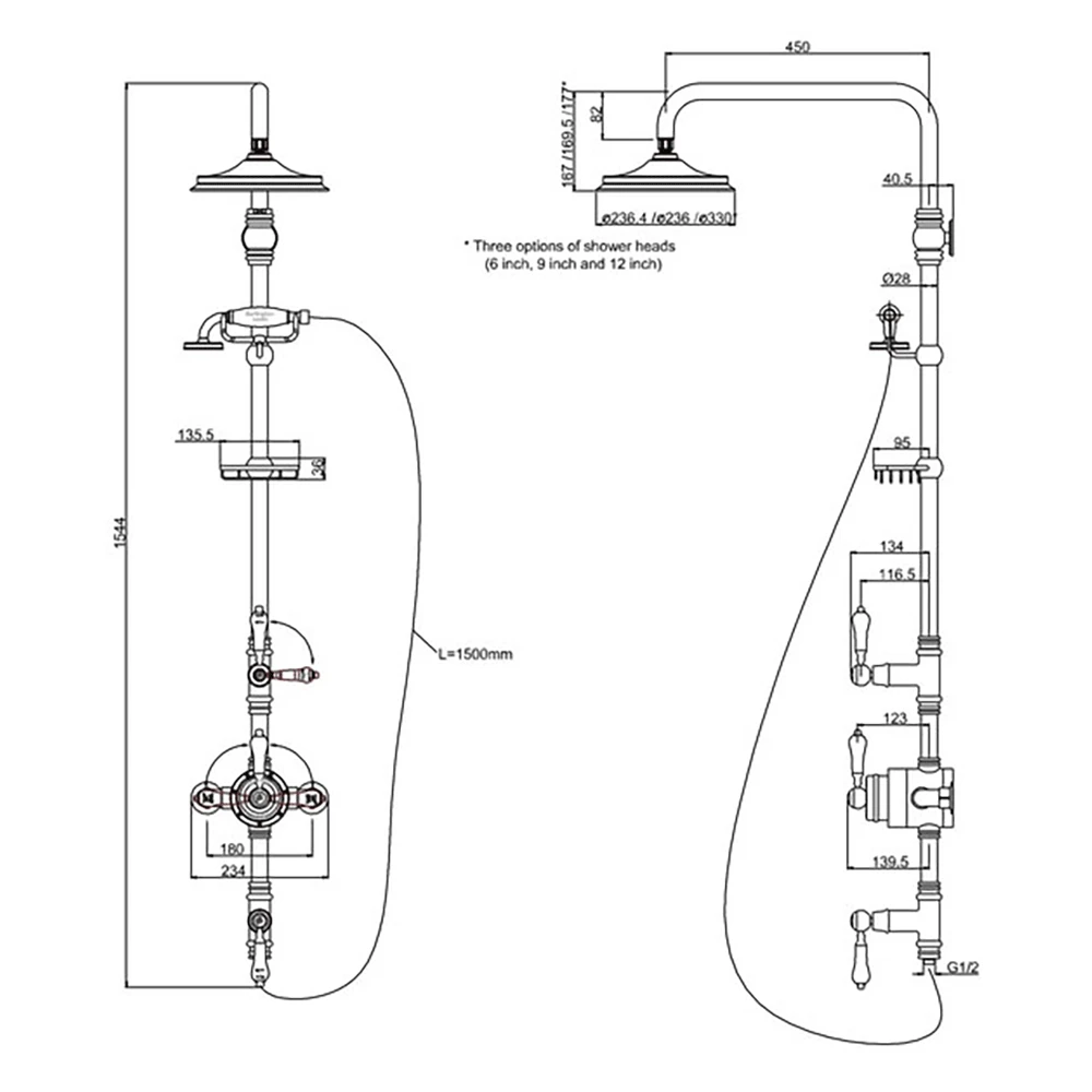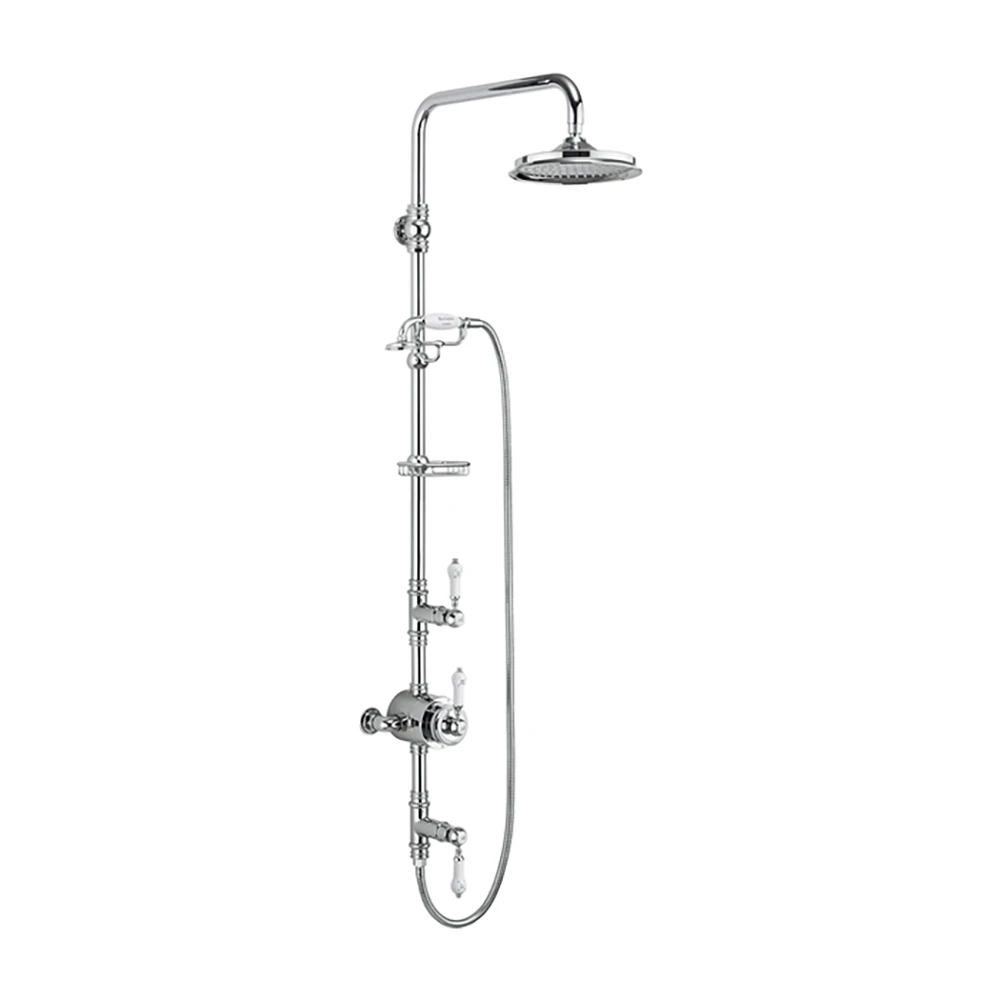- Exposed thermostatic shower valve, rigid riser, ceramic shower handset and fixed shower head