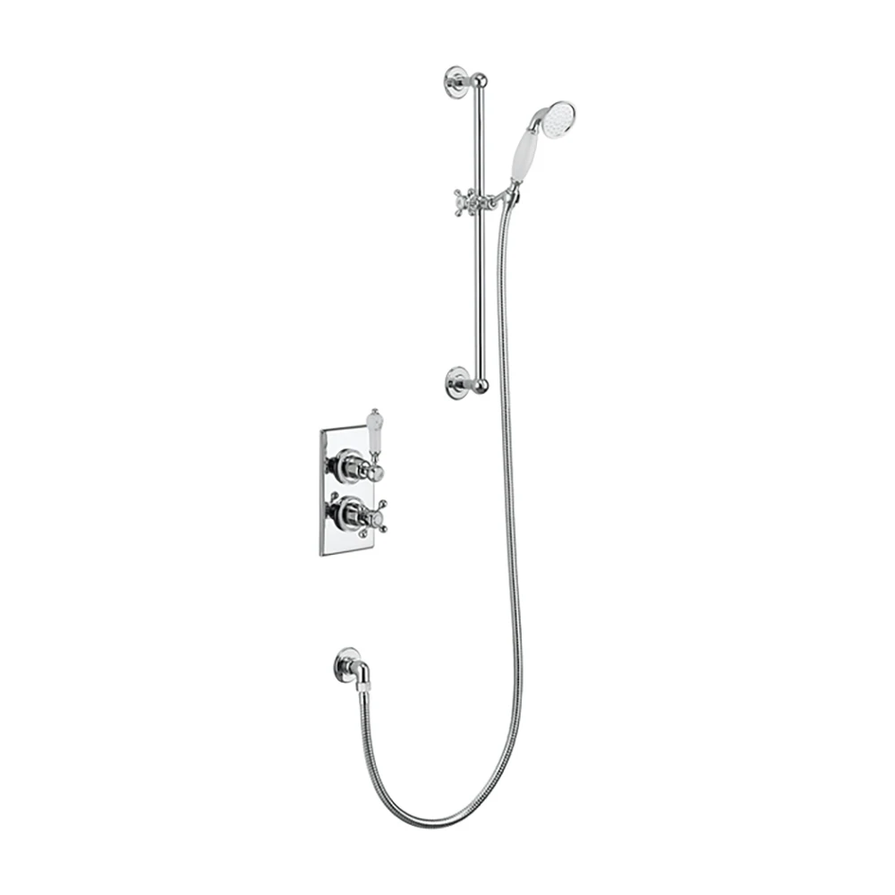 The Trent Concealed Thermostatic Shower Kit with Ceramic Handset is an amalgamation of solid brass, white ceramic accents and polished chrome. The single outlet concealed shower valve features a chunky ceramic lever to turn the water flow on and off, and a valve to adjust the temperature. This valve comes as standard with a Claremont handle however you can upgrade to an Anglesey handle to match your shower with other Burlington tapware within your bathroom.