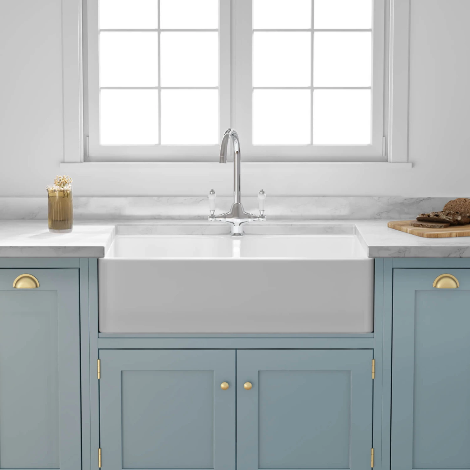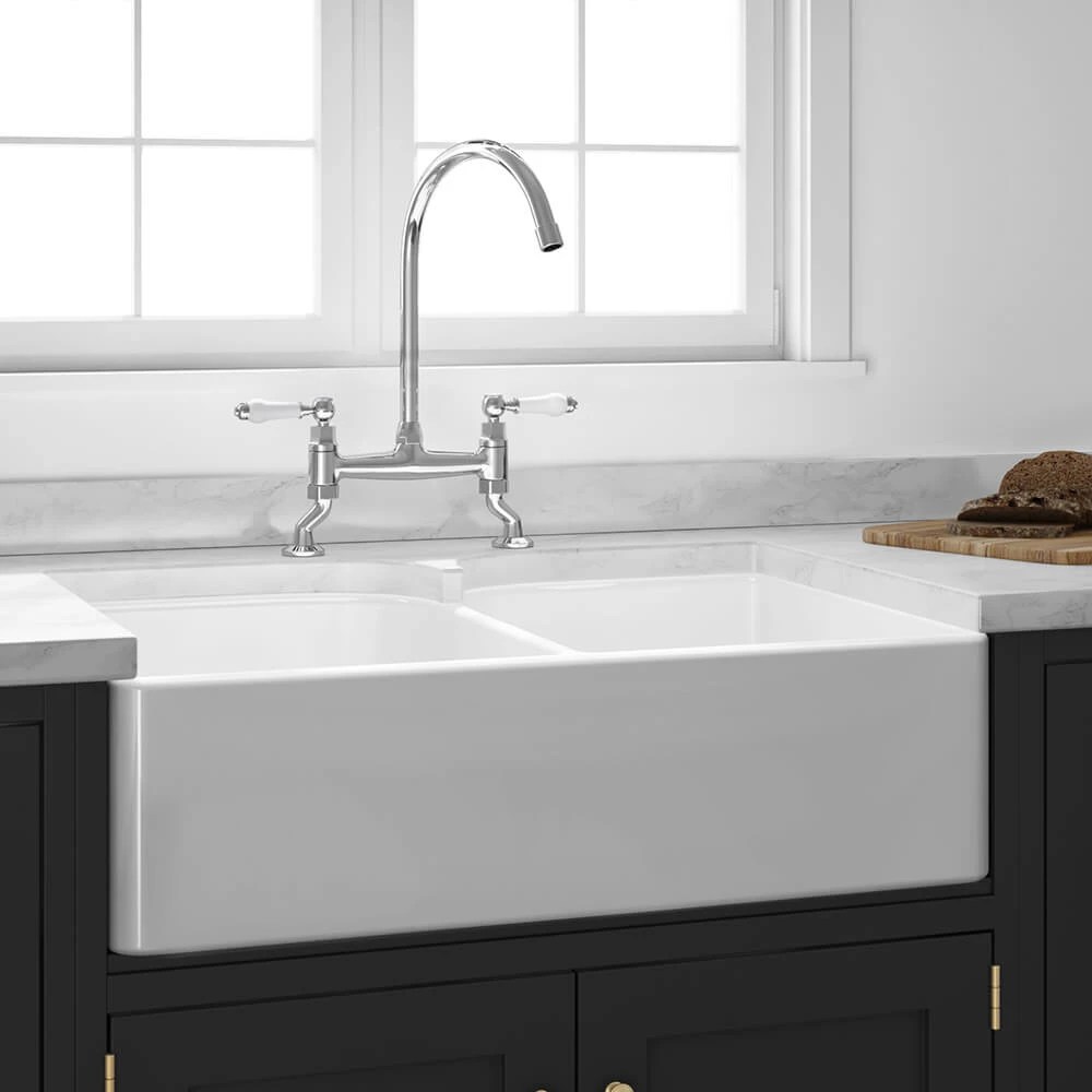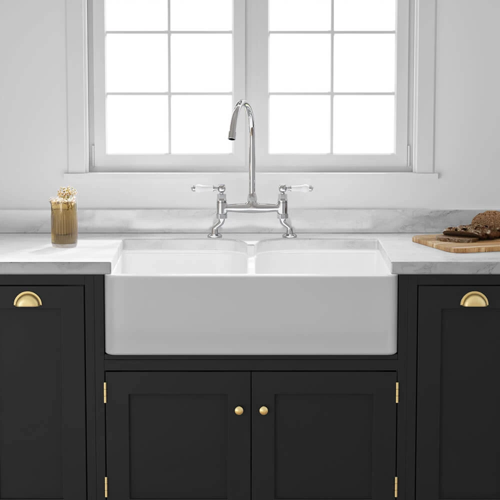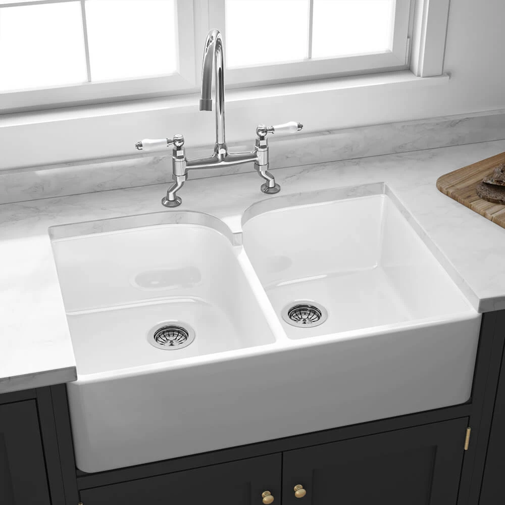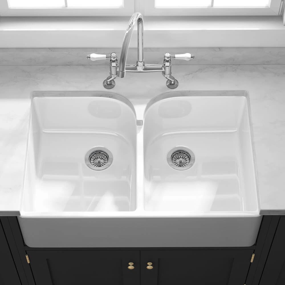 Add timeless country-kitchen charm to your home with this stunning fireclay Belfast sink. 2 generous-sized bowls offer plenty of practicality and are deep enough to fit even the largest of your pots and pans in under the tap.The Butler & Rose Double Belfast is made from traditional fireclay, a type of ceramic created when clay is heated and cured at upwards of 1,800°F. The resulting farmhouse-style sink has a nonporous surface, making it simple to keep clean. Unlike steel or composite granite sinks, which require some serious elbow grease to keep them looking at their very best, fireclay ceramic is brought back to new with a brief wipe of a cloth. Both durable and desirable, a fireclay sink is resistant to acids, alkalies, chips and scratches. The harder-than-rock material is extremely resilient and can comfortably stand the test of time.