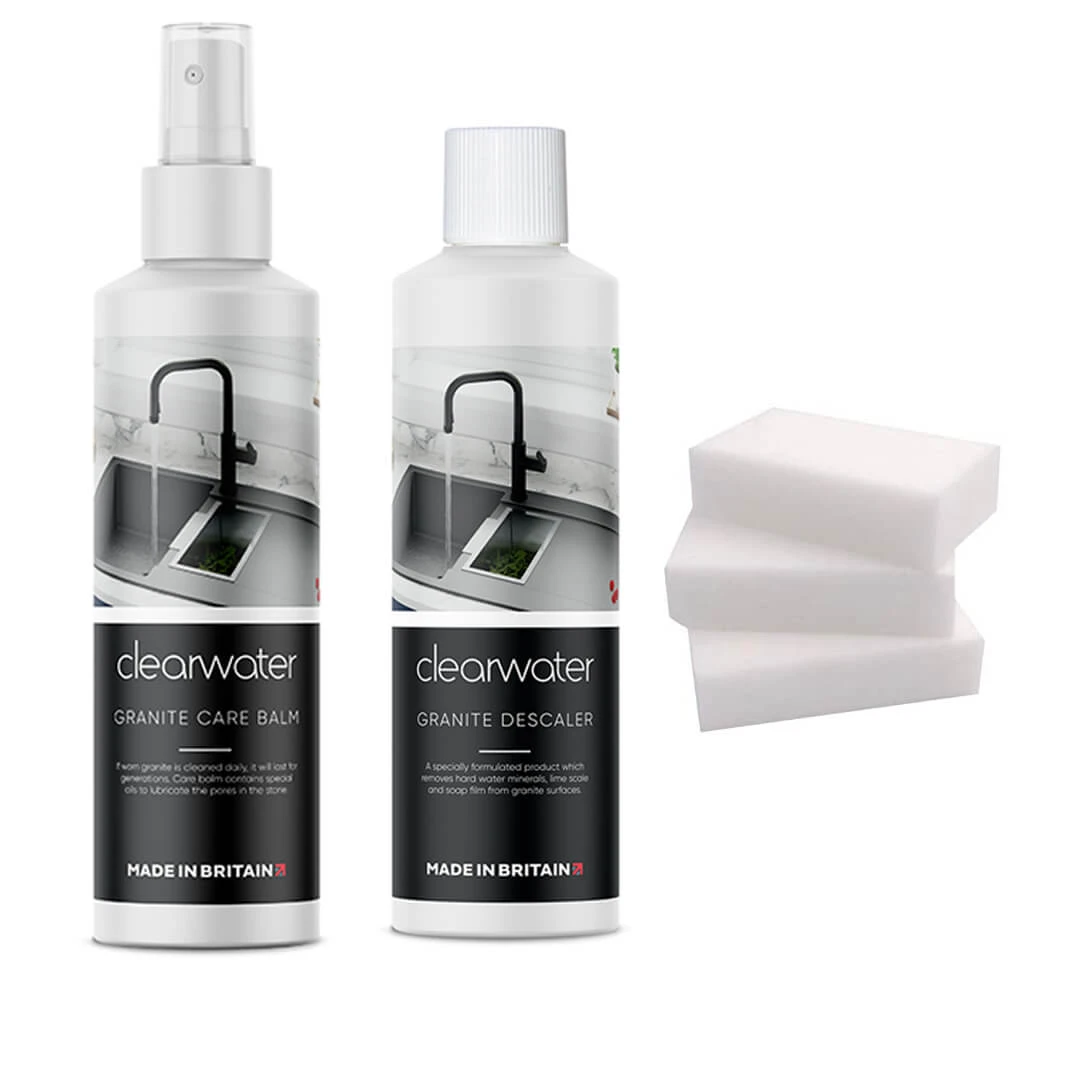 The perfect solution to clean and restore your composite granite sink back to full glory, the Clearwater granite care set really is the perfect sink cleaner. It comes with everything you need, including a descaling cleaner, a brightener, and a collection of magic sponges.