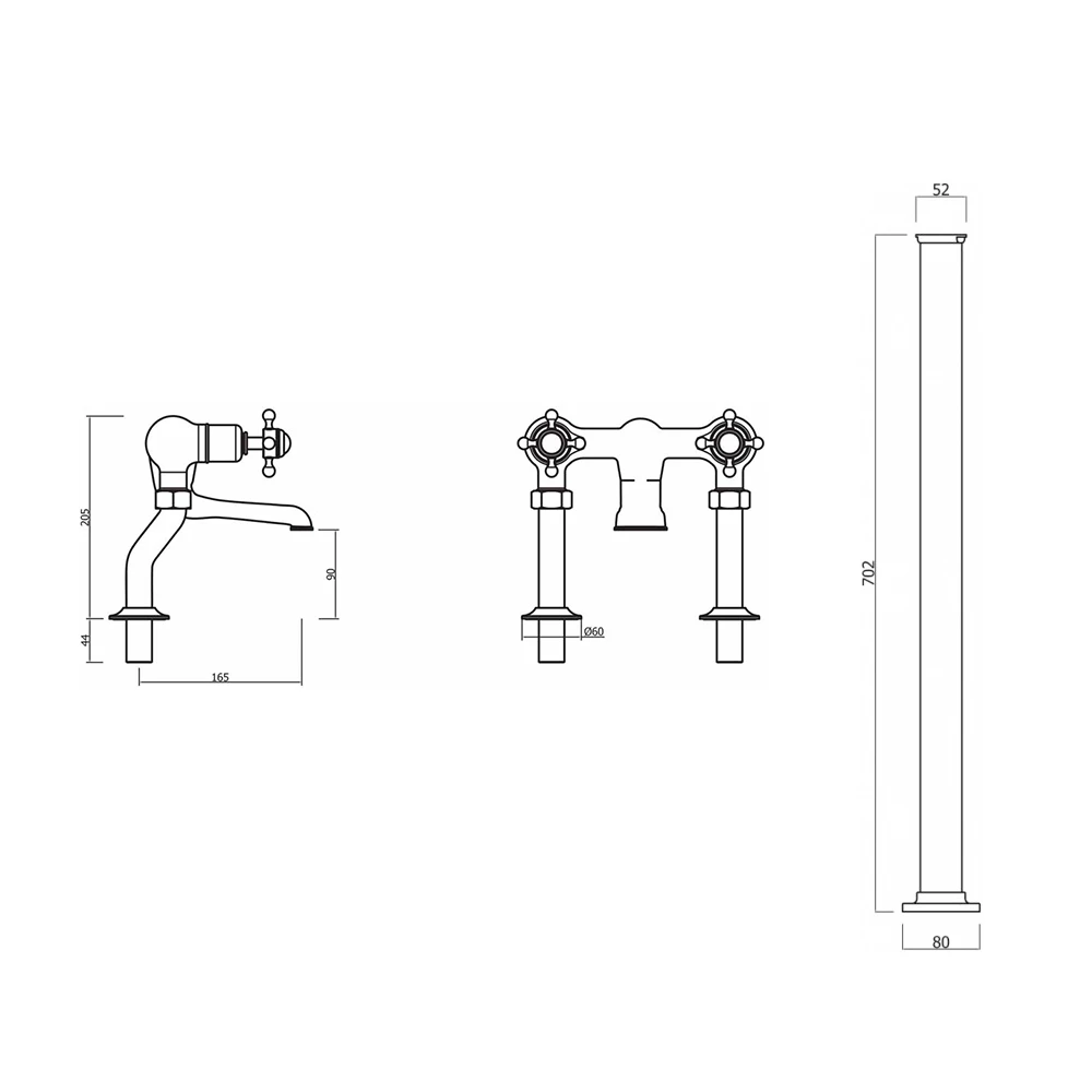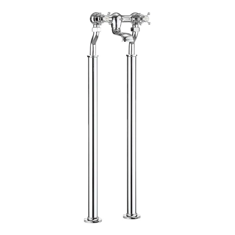 In keeping with its 19th-century influences, the Belgravia Crosshead Floor Standing Bath Shower Mixer features sculpted valves, crosshead handles with ceramic indices, wide-mouth bath spout, microphone-styled handset shower with hose and linked cradle holder, and bath legs with cover plates for a final touch.