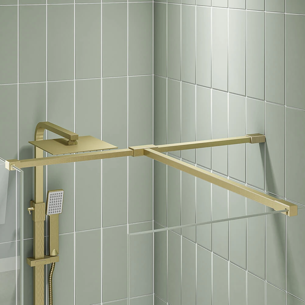 - Includes: modern 1 metre brushed brass support arm and T-piece to join the support arms