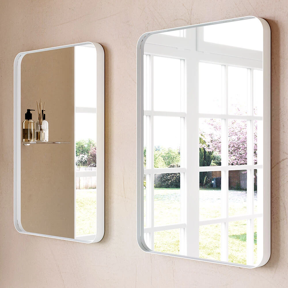This minimalist white mirror from Origins Living is set in a subtle matt white surround, reflecting on its minimalist style. The curved round corners of this rectangular mirror give it a softer feel and help it to blend into any modern bathroom.