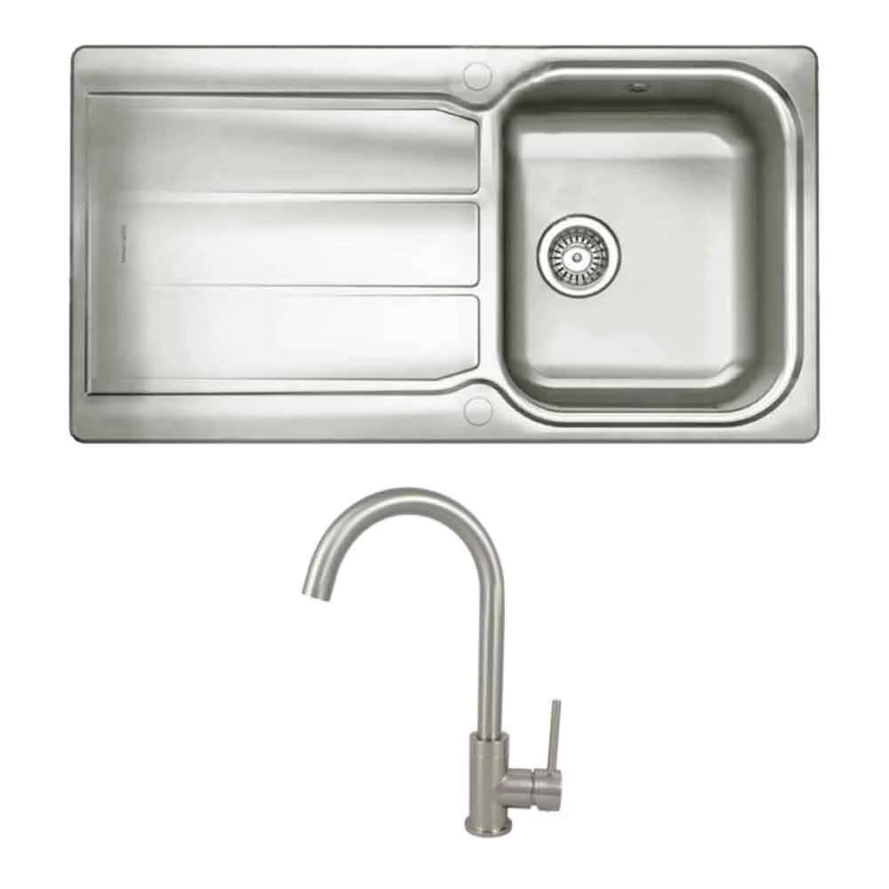 The Rangemaster Glendale Single Bowl Kitchen Sink & Vellamo Revolve Monobloc Mixer Kitchen Tap Pack is supplied with waste kit and a built-in drainer, for a sleek and seamless design. Furthermore, the inset sink is finished with a subtle ground-edge trim and fitted clips and seals, making it quick and easy to install. With reversible right or left hand instalattion, this brushed stainless steel sink and tap pack will fit perfectley into any layout and budget.
