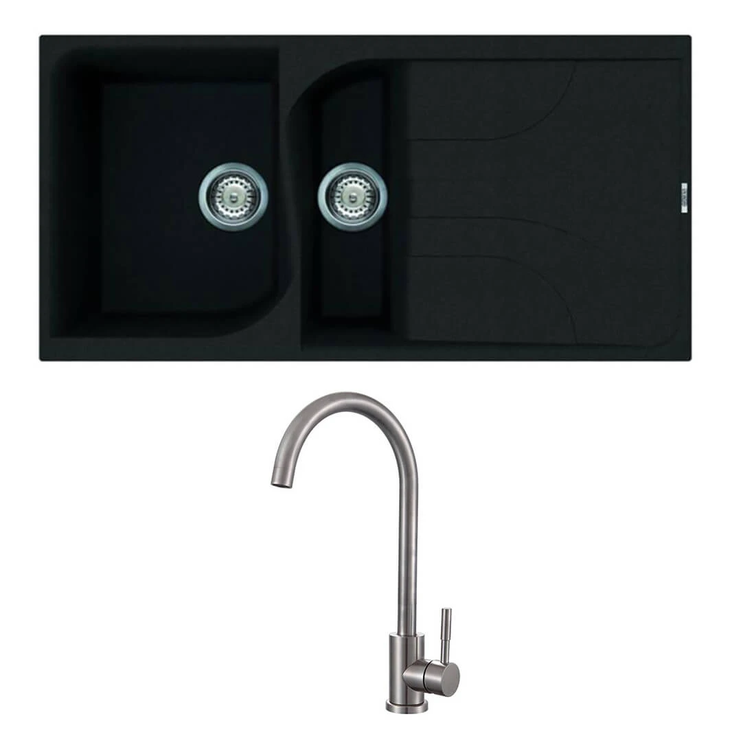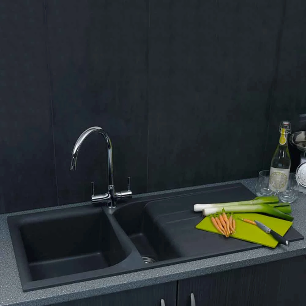 Designed to provide the perfect balance between style, quality, design and price, the Reginox Ego 1.5 Bowl Ghisa Black Composite Kitchen Sink & Vellamo Revolve Monobloc Mixer Tap Pack brings the latest trends to your kitchen.
