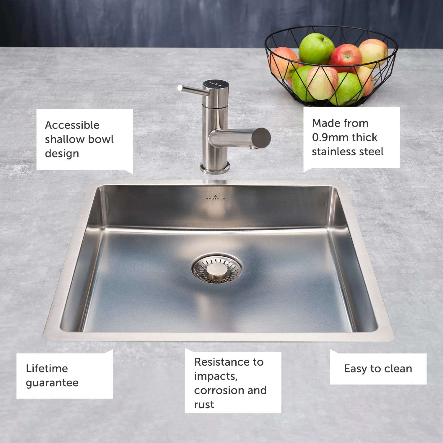 The New Jersey accessible shallow single bowl sink is a perfect blend of form and function. Its contemporary and stylish design will complement any kitchen decor. Crafted from robust 0.9mm thick 304 grade (18/10) stainless steel, this sink is a testament to strength and endurance.