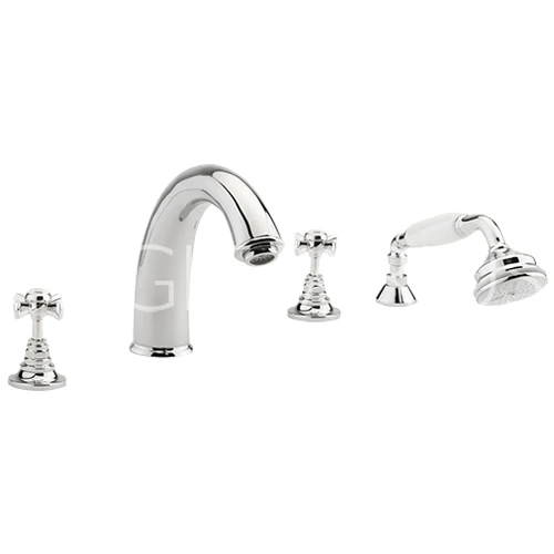 The Sagittarius Churchman four hole bath filler is a full bathtub set. It features two standalone taps and a stylish curved spout. There is also a handset that extends and be used like a showerhead in the bathtub. They all have a stylish chrome finish and the handset has a white ceramic handle.