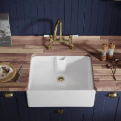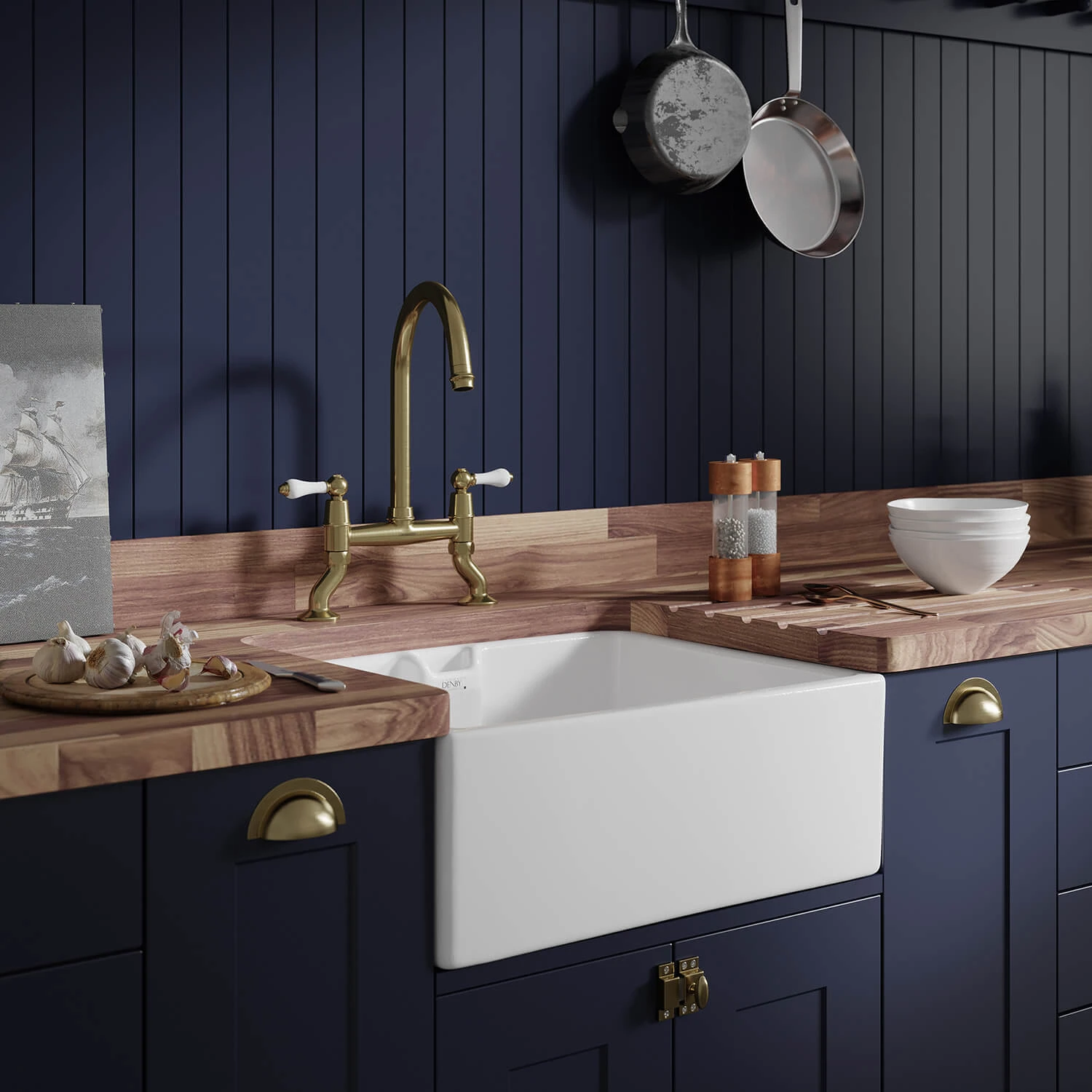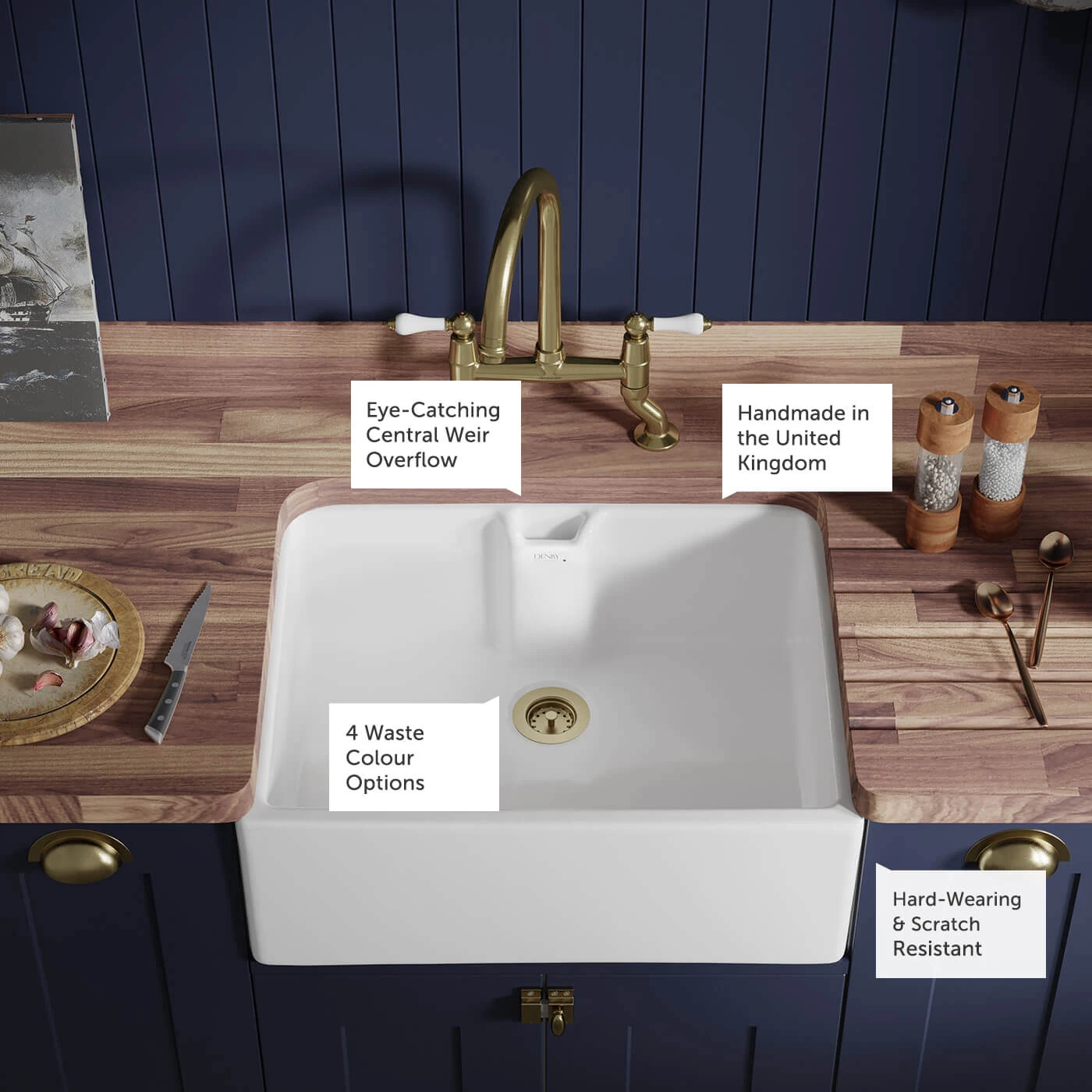 - Traditionally designed gloss white ceramic Belfast sink with soft sculpture profiles for a timeless appeal