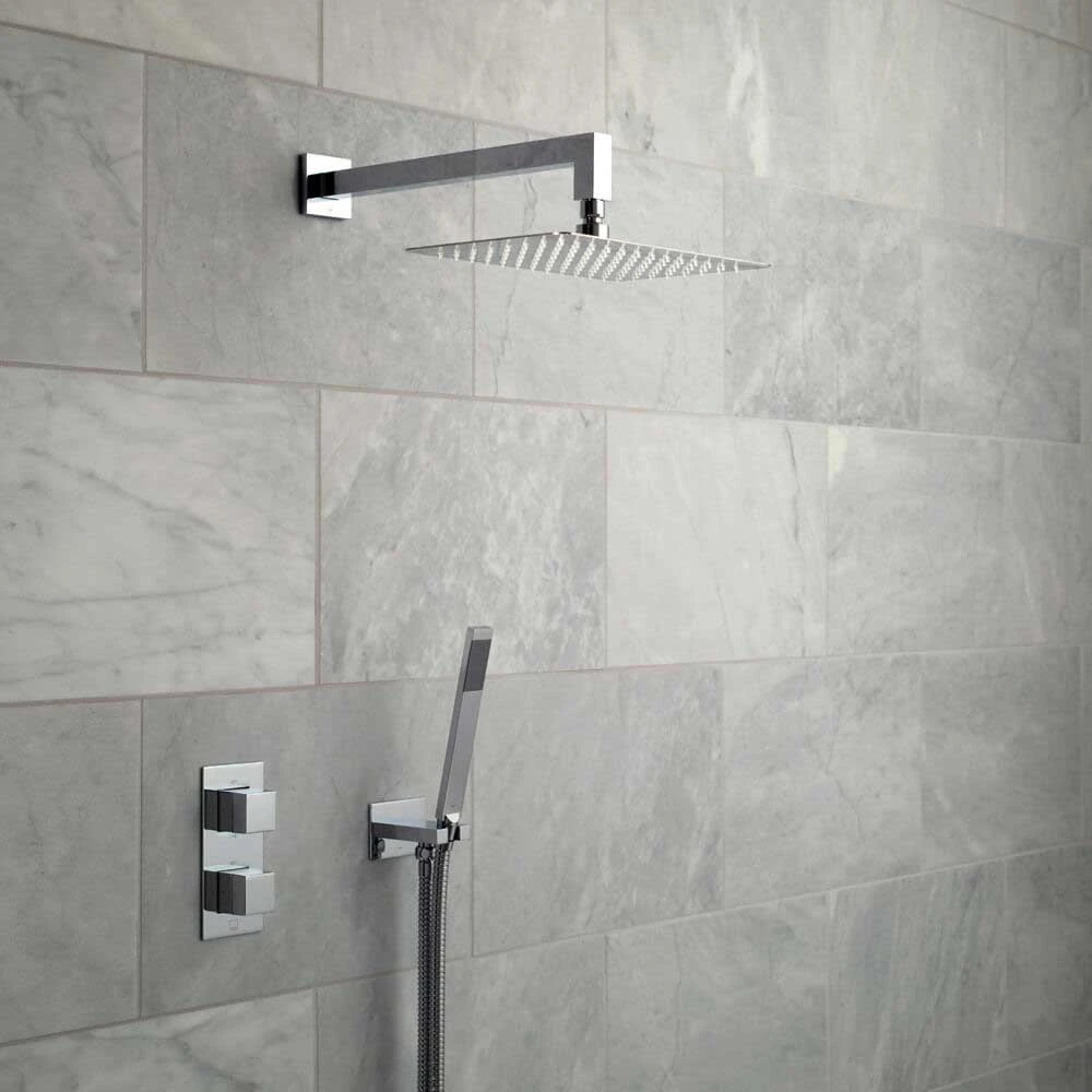 The Vado Notion Shower Package 21 is a stylish, all-purpose shower pack. The pack contains, a vertical 2 outlet thermostatic control valve with “All-flow’ function, an Aquablade 200mm x 300mm shower head and arm, an Instinct shower handset with hose and integrated outlet and bracket. The design encapsulates many modern design ideas such as square straight lines and high class chrome finish, to make this a shower package for 21st Century.