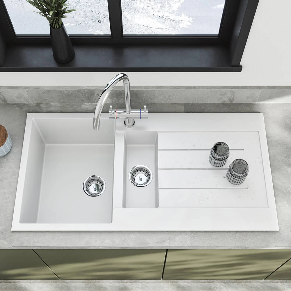 - All three finishes feature a pure matt colour without the sparkles or speckles that naturally occur in comparable granite quartz kitchen sinks